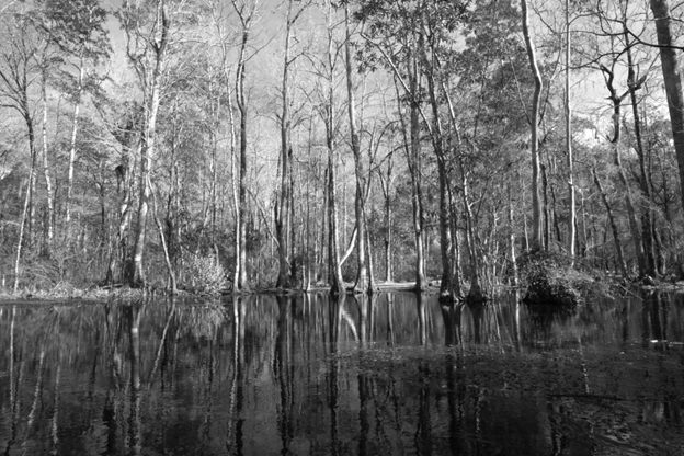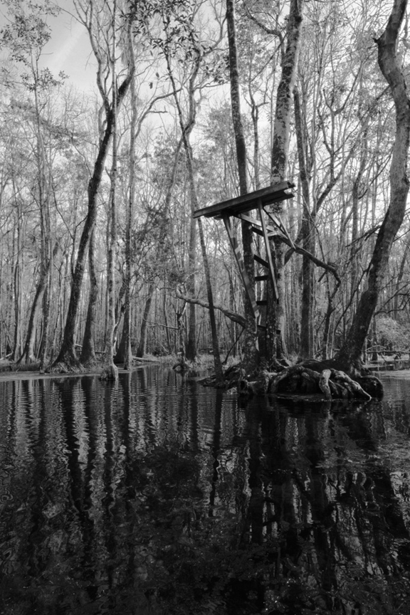 People say that Florida has no seasons, but this photograph says winter to me. The photo is centered on the homemade diving platform at Big Blue Spring on the Wacissa River. The trees, usually so lush, have few leaves, the shadows are long, and the swimmers have been gone for months. Winter on Florida springs is peaceful.