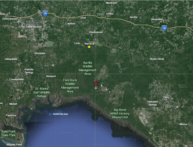 A map of the Big Bend region that it is the home of the Wacissa River. The yellow star indicates the location of the river’s origin; the red star indicates where the Wacissa joins the Aucilla.