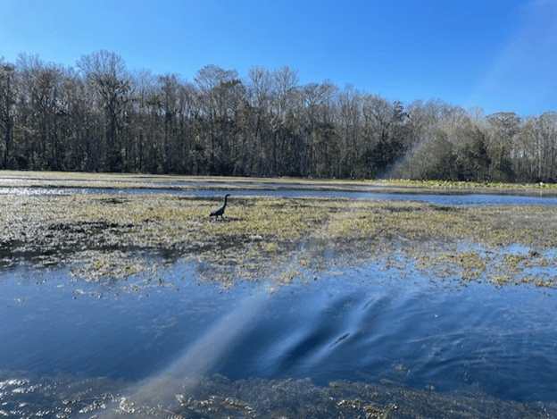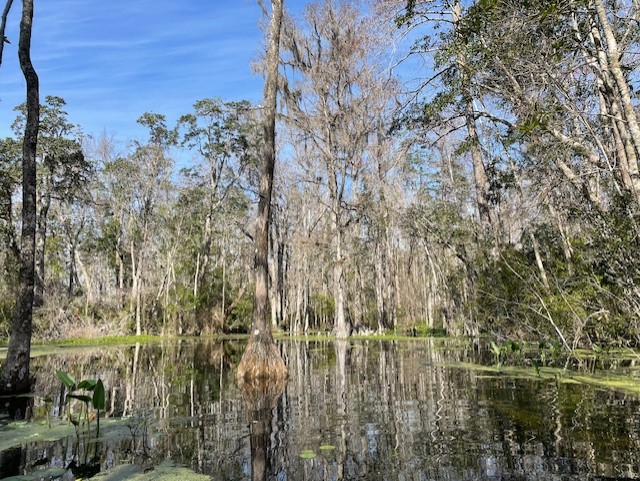 Flooding back into the forest also provided cover for fish. Hurricane Idalia passed over the area in August 2023 and the flood waters still had not completely receded in February 2024. Florida is so flat, its water table is so shallow, and there often is so much precipitation in the rainy season that floods can last a very long time. When the water penetrates back into the woods, the cypress knees and shrubs can provide extra cover from predators for small species.
