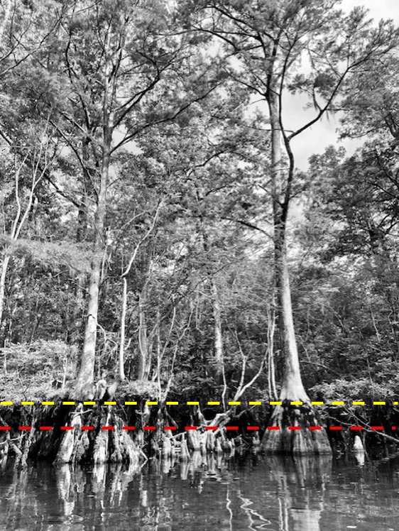 Closer view of some of the cypress trees with dotted lines representing their high water lines.