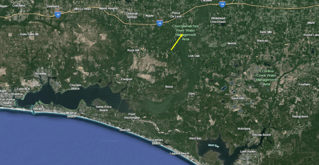 Google Earth images of the location of Morrison Springs on the Choctawatchee River (yellow arrow, top) and of the spring itself (bottom). The headspring appears almost as wide as the Choctawatchee River into which it flows.