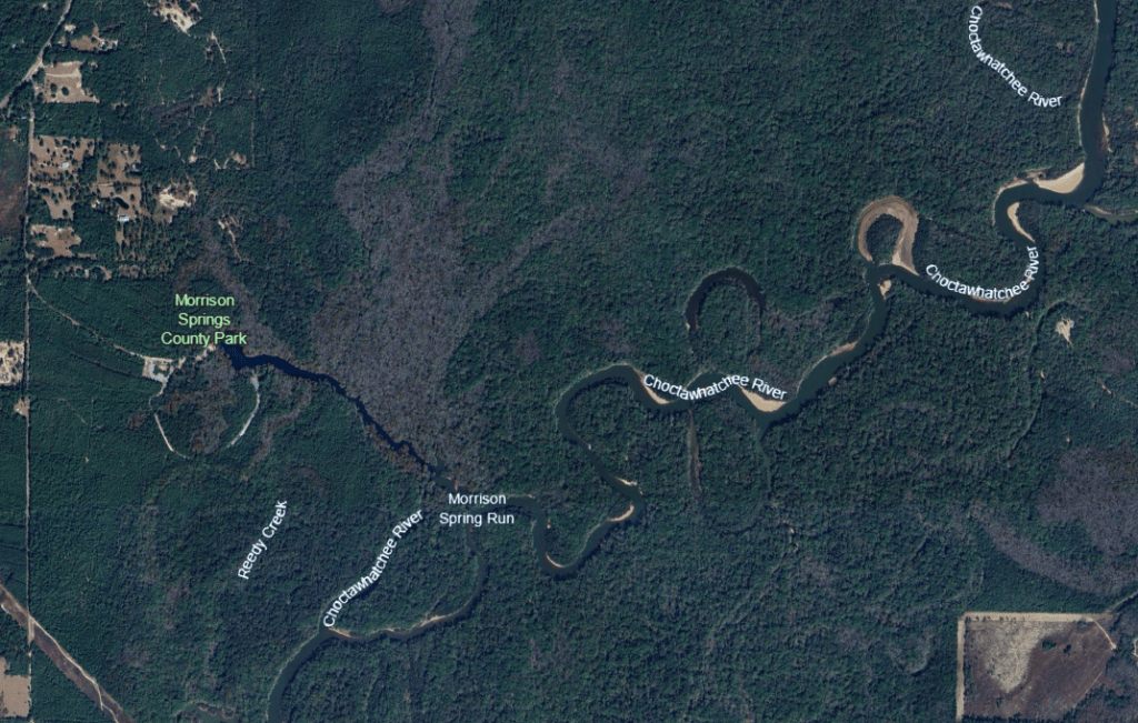 Morrison Springs is a large spring, with a 250-ft diameter main pool. This pool contains three cavities, one of which descends to 300 feet, that produce something on the order of 50 million gallons of water per day, so the spring is categorized as 2nd magnitude, despite its size. Located just south of the town of Ponce de Leon and downstream of Ponce de Leon Spring, Morrison flows down a broad and somewhat shallow run into the Choctawatchee River. The Choctawatchee River meanders down to the Choctawatchee Bay, which opens to the Gulf of Mexico at Destin.