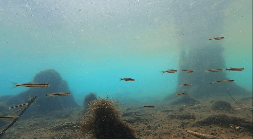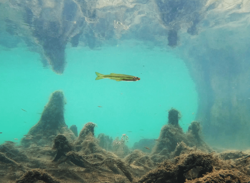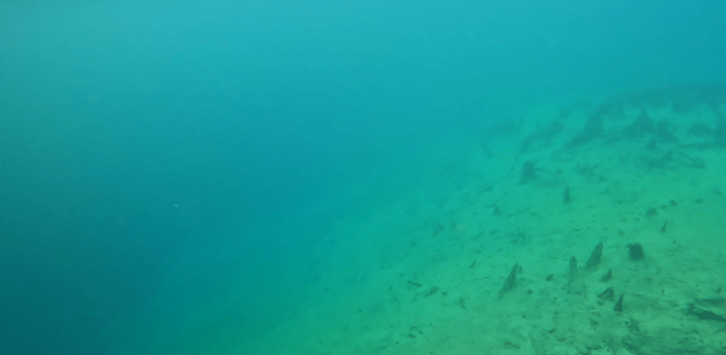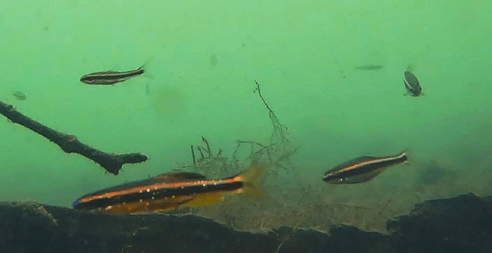 Alas, the water clarity declined once I left the headspring area. Despite the murkiness, I was able to film several different species of fish, including a bowfin (Amia calva), golden silversides fighting (Labidesthys vanhyningi), and the crown jewel: bluenose shiners (Pteronotropis welaka). I have been asked many times if I have seen them in my visits to springs and finally I can say yes. This species is categorized as a state-designated threatened species due to its isolated populations that are vulnerable to extirpation (local eradication).