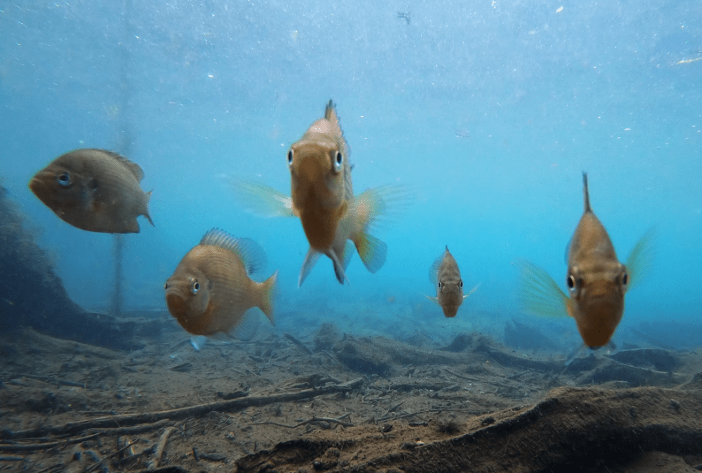 Bluegill sunfish (and one spotted) missing their typical bar patterns.