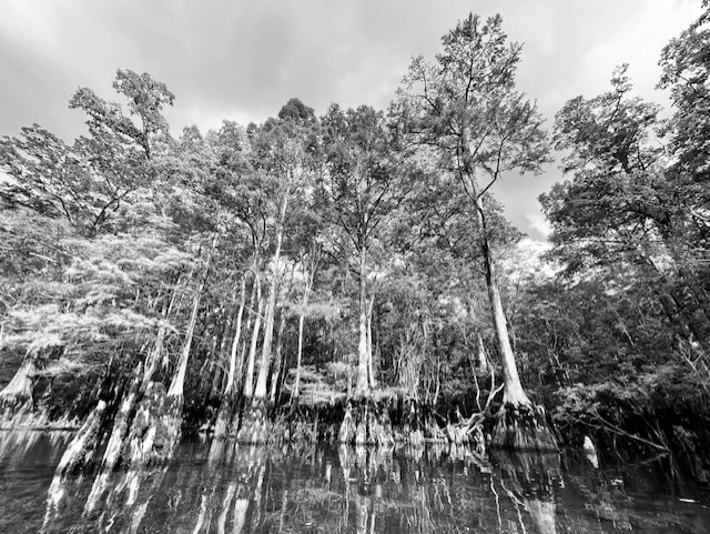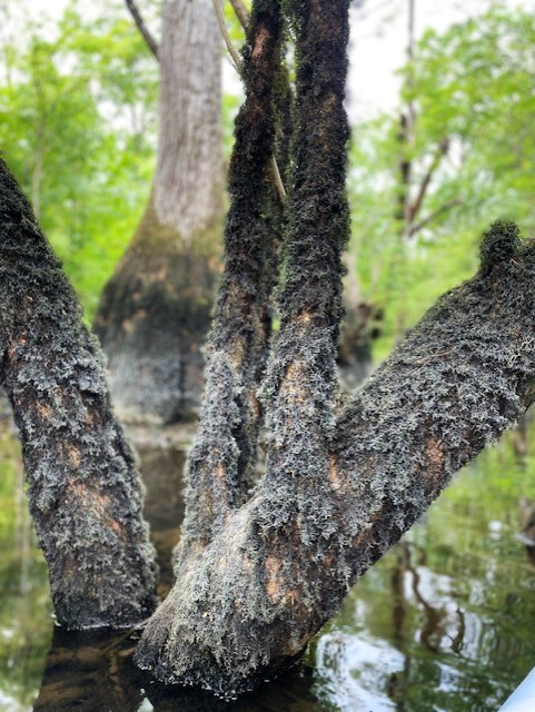 Upon my return to the spring months later, two characteristics struck me: 1) the thick and lovely cypress forest all along the banks and 2) the high water lines on the trees. There were two obvious lines, one about 1/2 meter and one about a meter above the surface of the water on the day that I visited. The prominence of these lines suggest that the spring run attains this stage (water height) often.