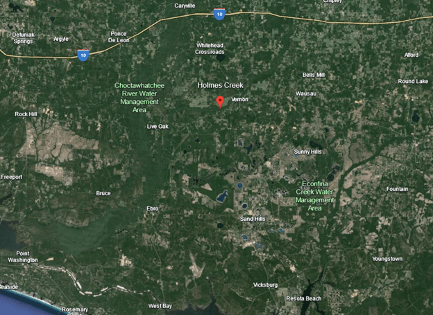 Holmes Creek is a tributary of the Choctawatchee River and flows into it from the east. Originating far to the north in Alabama, it meanders through agricultural land until it reaches the Choctawatchee. Springs dot the reach on either side of Vernon.