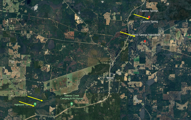 Google Earth images showing the landscape around Holmes Creek (top) and the locations of the springs that I visited (bottom). In north to south order, these springs were Cypress, Beckton, Brunson Landing, and Hightower.