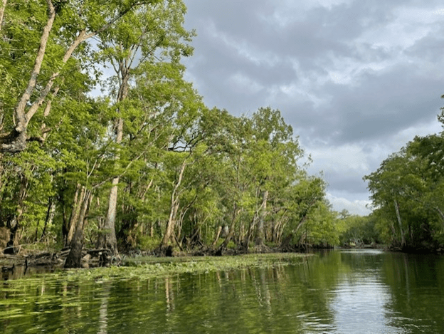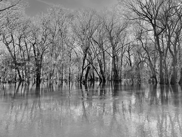 Cypress Spring in February with no shoreline due to flooding. The darker areas represent shadows from the trees as the water was all brown. The water appeared to be continuous with Holmes Creek.