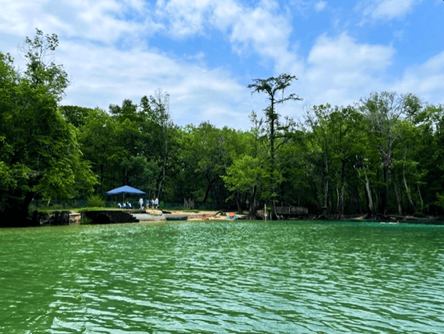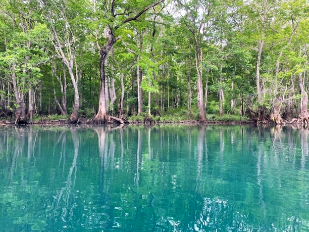 When I returned in May, I tried to visit Cypress Spring on a nice sunny afternoon. I was excited to see it as I had heard that the DEP uses it as their “low algae” site, so I was anticipating a lovely run. I floated down Holmes Creek from the Cotton Landing Recreation Area boat ramp and as I turned the corner to go up the run, I realized that I was headed straight for a powerboat parked in the run with people standing around it. A powerboat (and a party) might scare off the fish, so I decided to come back early the next morning. I returned after a storm passed through the area in mid-morning and I was happy to see that there were only four young adults swimming and enjoying the beauty of the headspring. The large, cobalt blue vent was glorious.