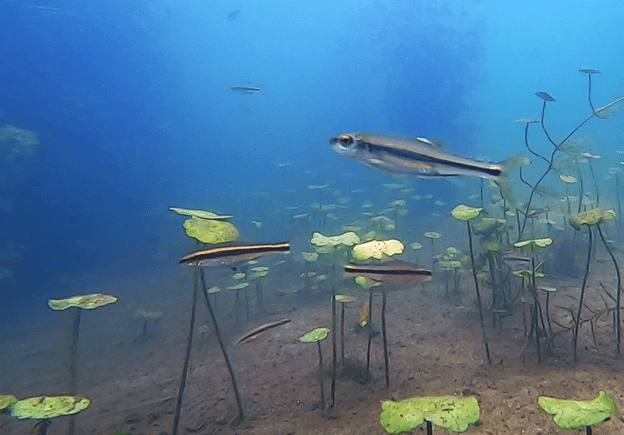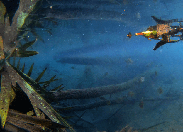 Several predatory fish near the confluence of Brunson Landing Spring with Holmes Creek: chain pickerel (top), bowfin (middle), and largemouth bass (bottom) with a spotted sunfish behind it.