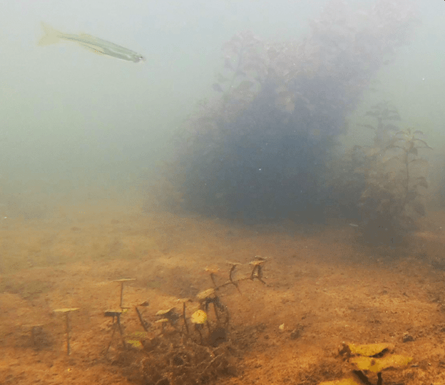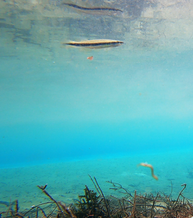 Close to the confluence of the spring with the river, however, I found a fair number of fish, even with the low water clarity. Several of these fish near the creek were piscivorous (fish eating): chain pickerel (Esox niger), bowfin (Amia calva), and largemouth bass (Micropterus salmoides).