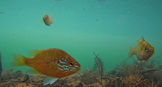 A dollar sunfish with spotted sunfish (Lepomis punctatus, top), a (likely) weed shiner with two sailfin shiners (middle), and a blackspotted topminnow (bottom). It is funny that this screenshot is very similar to the one that I took of a topminnow at Cypress Spring, but then topminnows typically cruise just under the surface of the water–hence the name.