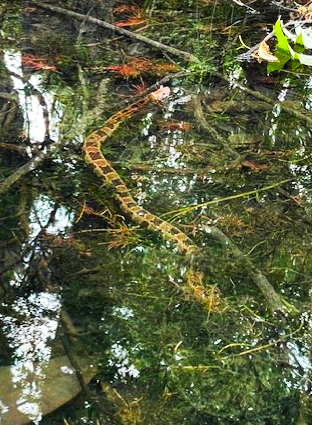 I also met this nice juvenile southern water snake (Nerodia fasciata). It gave me a lot of time to get a camera in the water, watching me closely the entire time, but I flailed around too long trying to get close enough in the flow without scaring it with the paddle and it swam away–alas.
