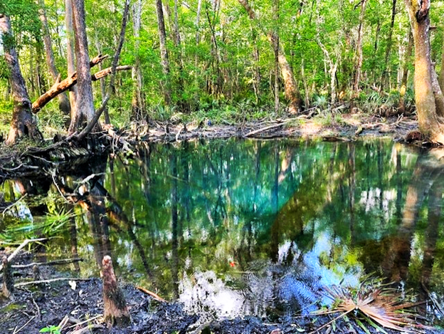 When I tried to visit the springs in February, all of the springs were the same shade of muddy brown. I think that I could have paddled through the forest to reach them. The water was so high that I think that Holmes Creek was continuous with the parallel-running Cypress Spring. I found the spring only by using the satellite feature on my phone and then finding the disturbance of the boil.