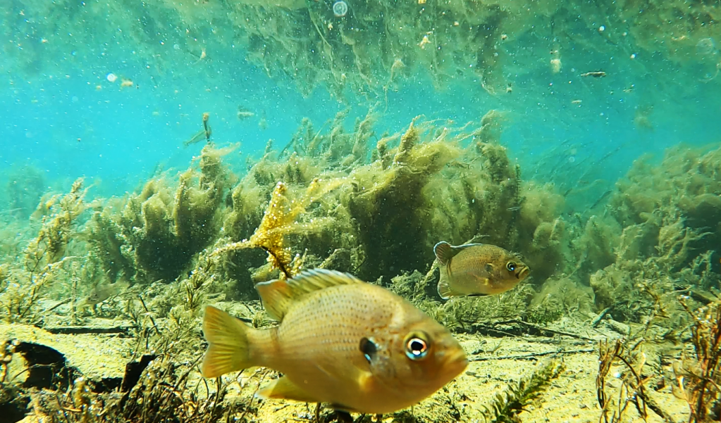 Thick algae with spotted sunfish just downstream from the canoe launch.