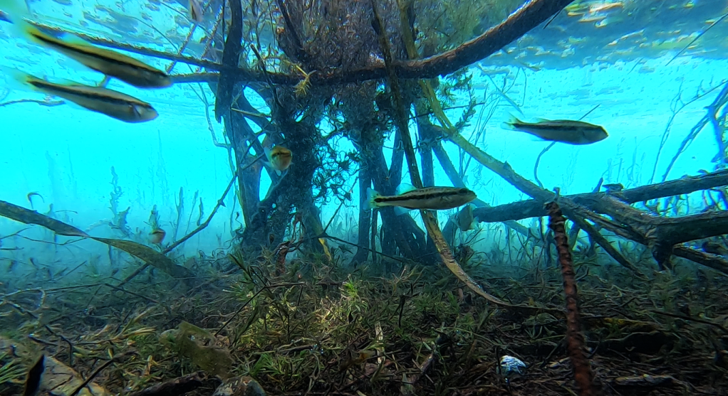Several juvenile largemouth bass passing through as two bluefin killifish (Lucania goodei) flared bright blue dorsal fins in a territorial display.