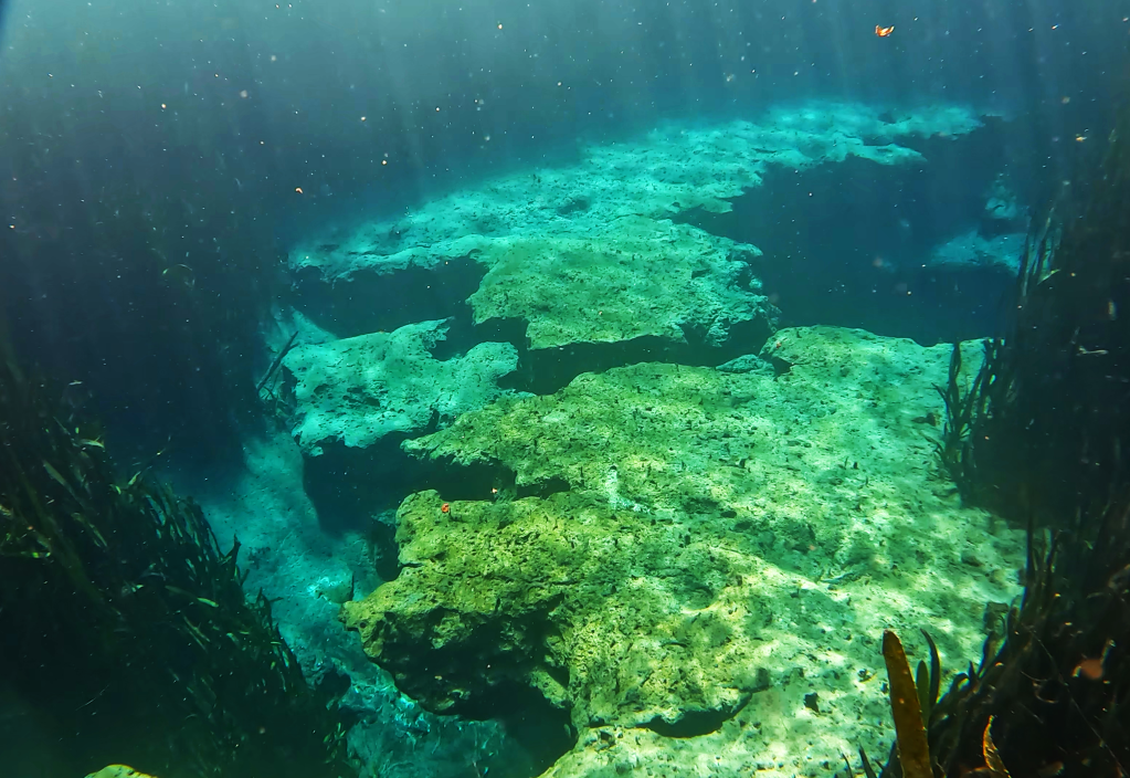 The Shangri-La second vent just off shore, photographed above the water (top) and underwater (bottom).