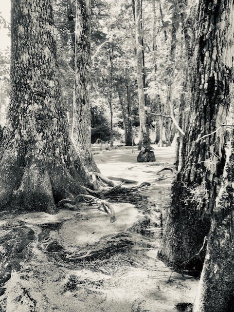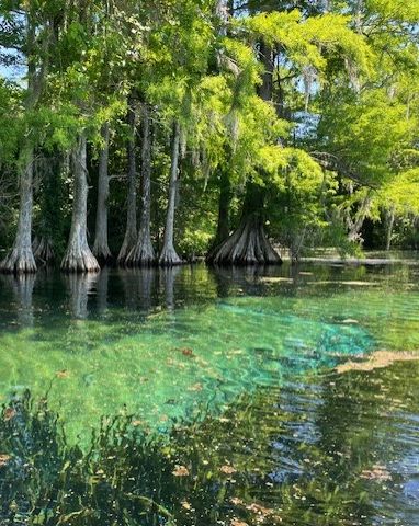Cypress trees in the shallows of Jackson Blue Spring. Duckweed (Lemna sp.) covered the surface of the water in many areas.