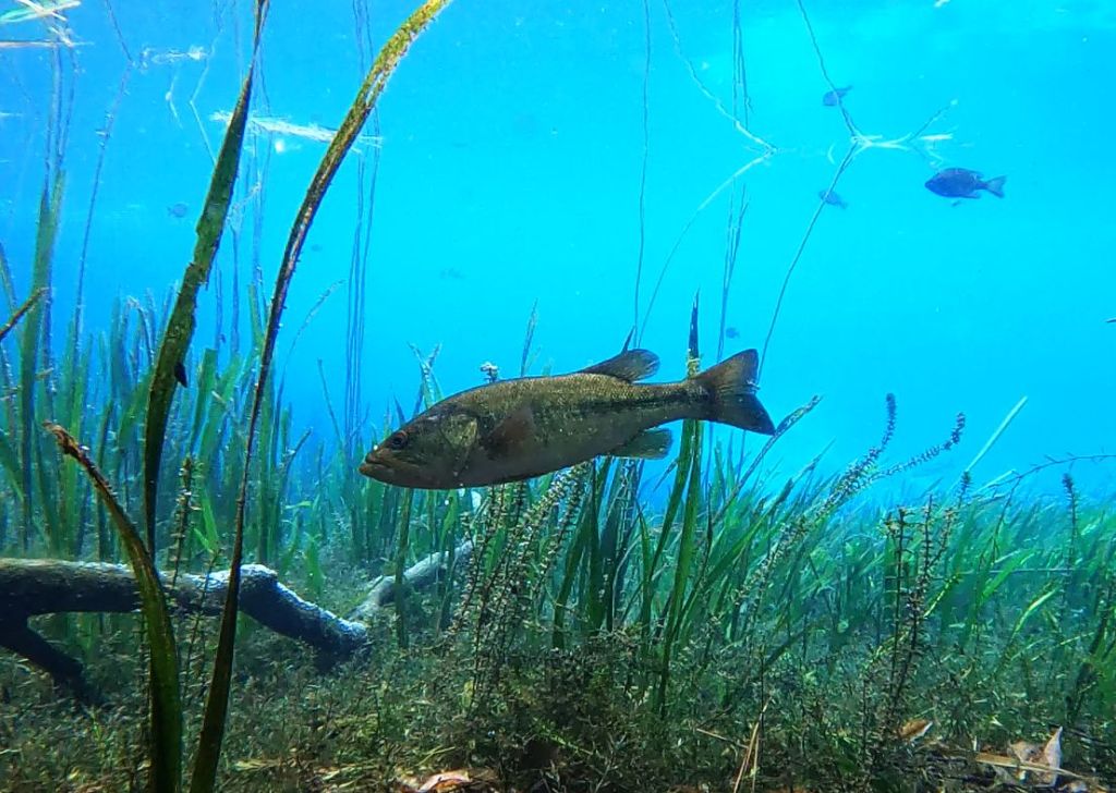 Some impressive predators: a largemouth bass cruising through the site (top) and a video of another feeding (bottom).
