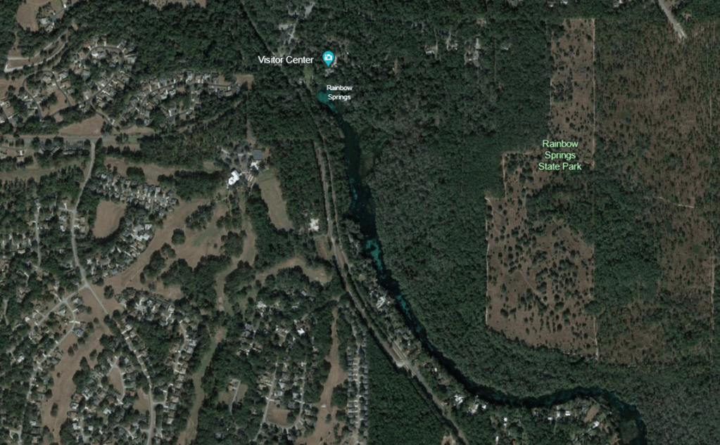Google Earth images of the landscape around Rainbow Springs and of the spring itself. The blue of the run is obvious even from these high elevation images. The darker areas are thick beds of plants.