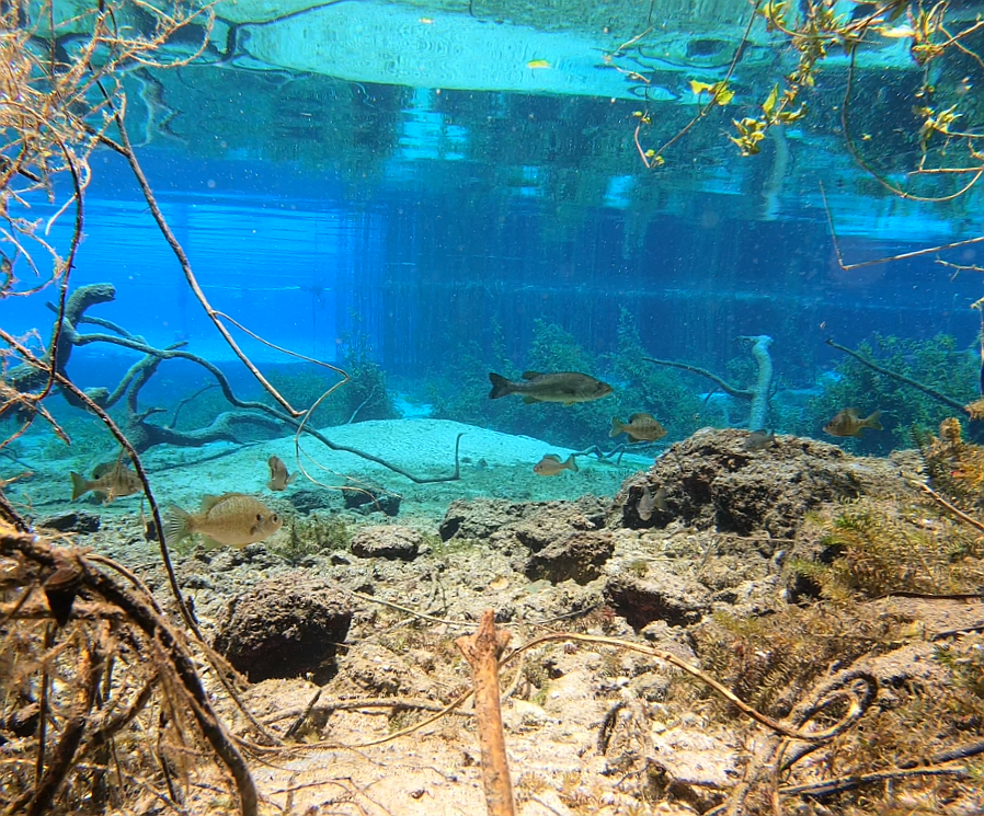 A largemouth bass (Micropterus salmoides), a redear sunfish (Lepomis microlophus), a redbreast sunfish (Lepomis auritus), and some bluegill sunfish (Lepomis machirochirus) up at the headspring.