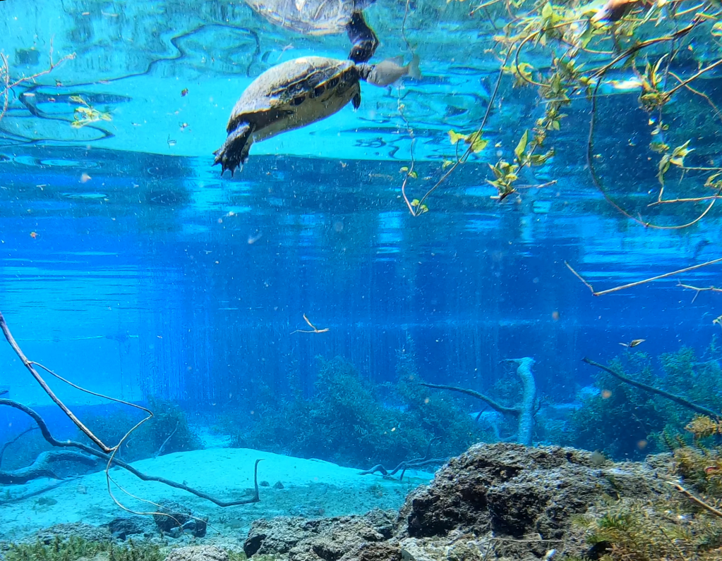 In addition to the number of predatory fish, the number and diversity of turtles was striking. The turtles favored the dense grasses that cover the east side of the run, which is a conservation area off limits to visitors. When I floated past that area, turtles were everywhere, resting on the grasses and swimming between them. However, I got turtles on video all along the run.