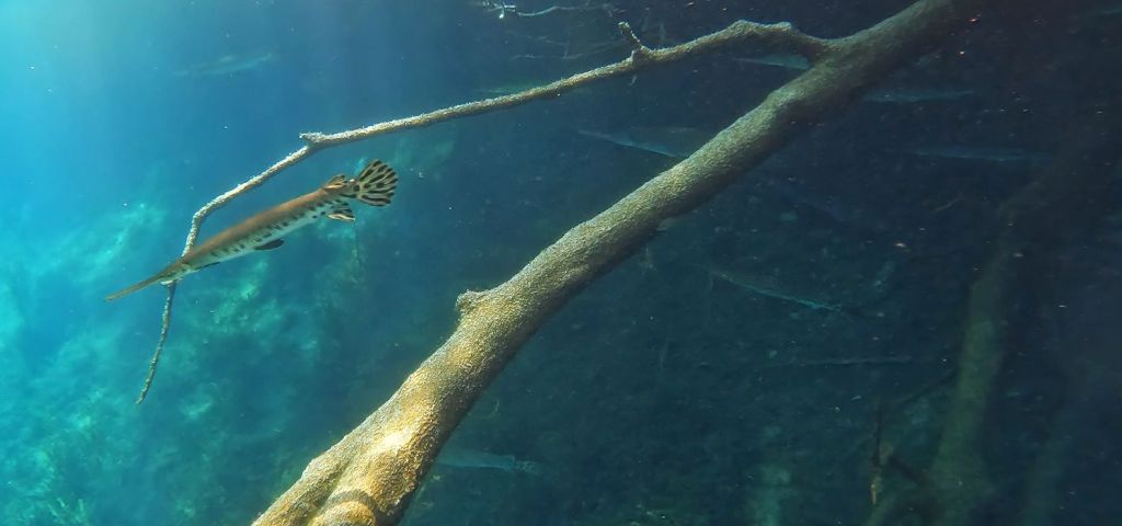 A gathering of longnose gar around a downed tree.