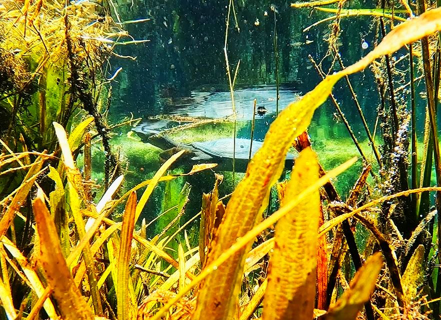 Three of the many turtles that I observed in Rainbow Springs, including on the bottom, a Florida softshell (Apalone ferox).