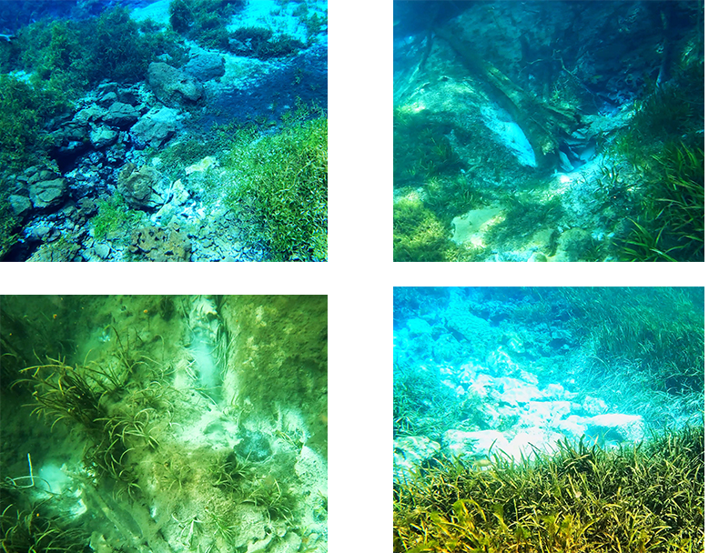 Underwater views of several vents or sand boils, starting with one of the headspring vents in the upper left-hand corner and ending with cloudy plumes coming from sand boils downstream in the lower left-hand corner.