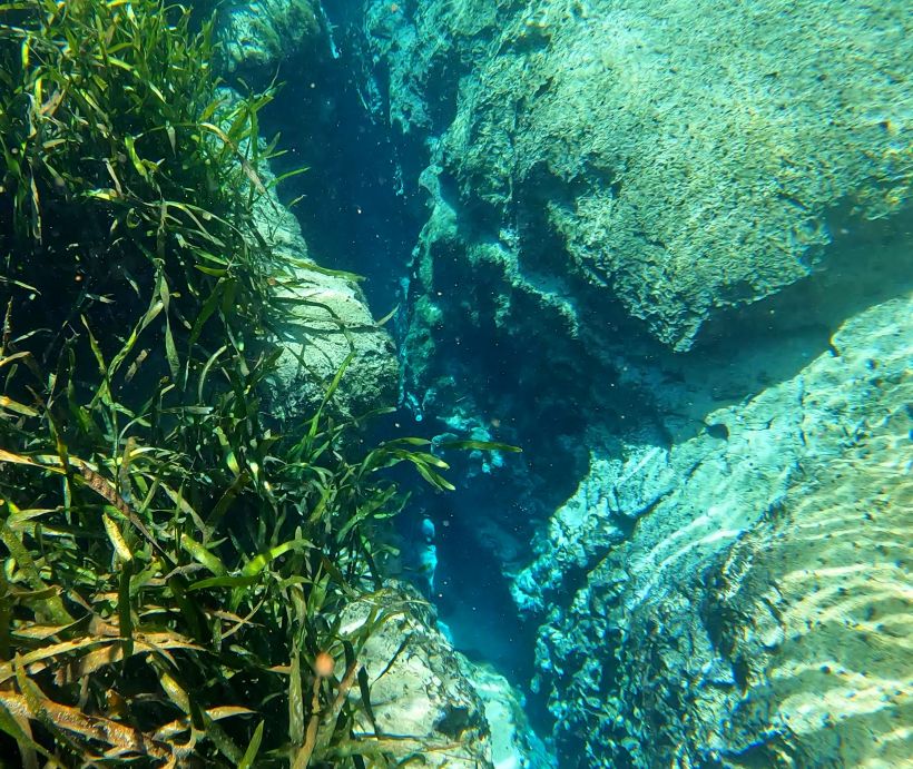 Alligator Spring vent above water (top) and the limestone wall of the vent below water (bottom).