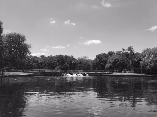 I visited Sulphur Spring first, after securing a permit from some very nice people at Film Tampa Bay (I thought that process was funny because the group issues permits for companies making feature films and whatnot). The park hosts two large pools. One is a round pool of spring water that fills the run through a dam. The other looks like a regular swimming pool. From the round pool, after the water goes through the dam, it travels down a short run and into the Hillsborough River. The banks of the run are partially constrained by cement and metal walls and other park structures.