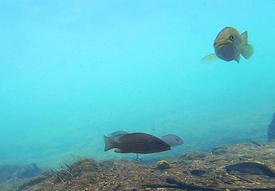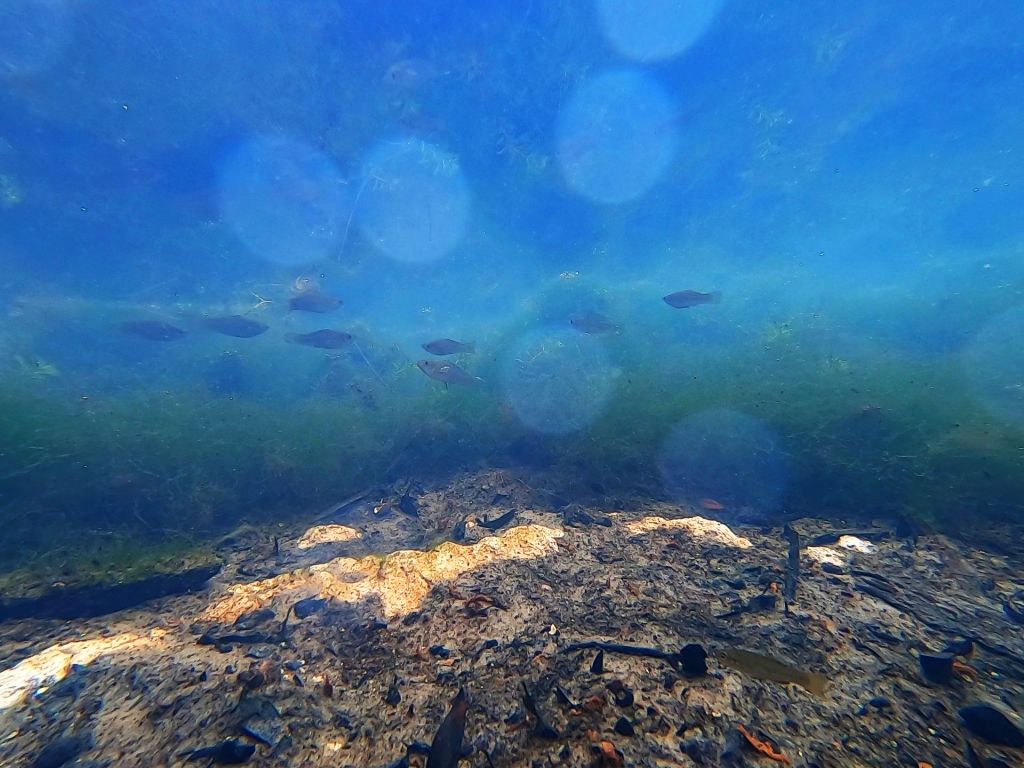 I recorded an impressive number of sizeable largemouth bass (Micropterus salmoides)–also, loads of sunfish, particularly spotted sunfish (Lepomis punctatus)–among the ten sites that I collected video. The clear water gave some good views of bowfin (Amia calva) as well. The rippling motion of their dorsal fins is a cool way to move.