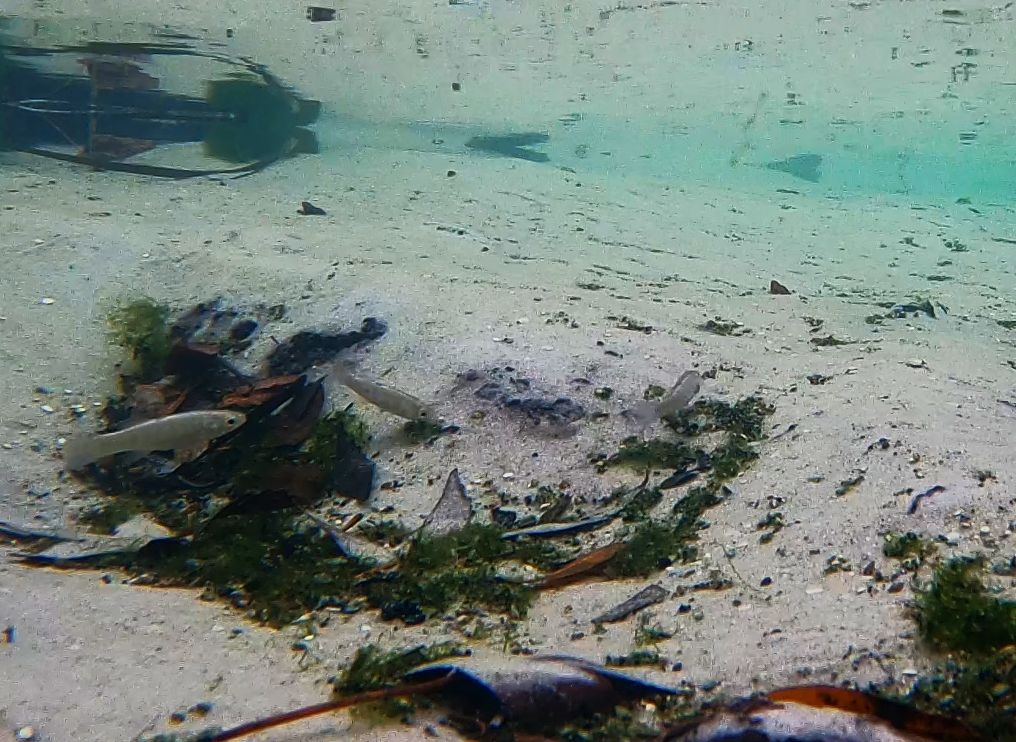 A skinny largemouth bass at the headspring in March and a bowfin with a spotted sunfish just downstream in January. I mention the difference in sample time here because the algae is green the top photo and brown in the bottom photo.