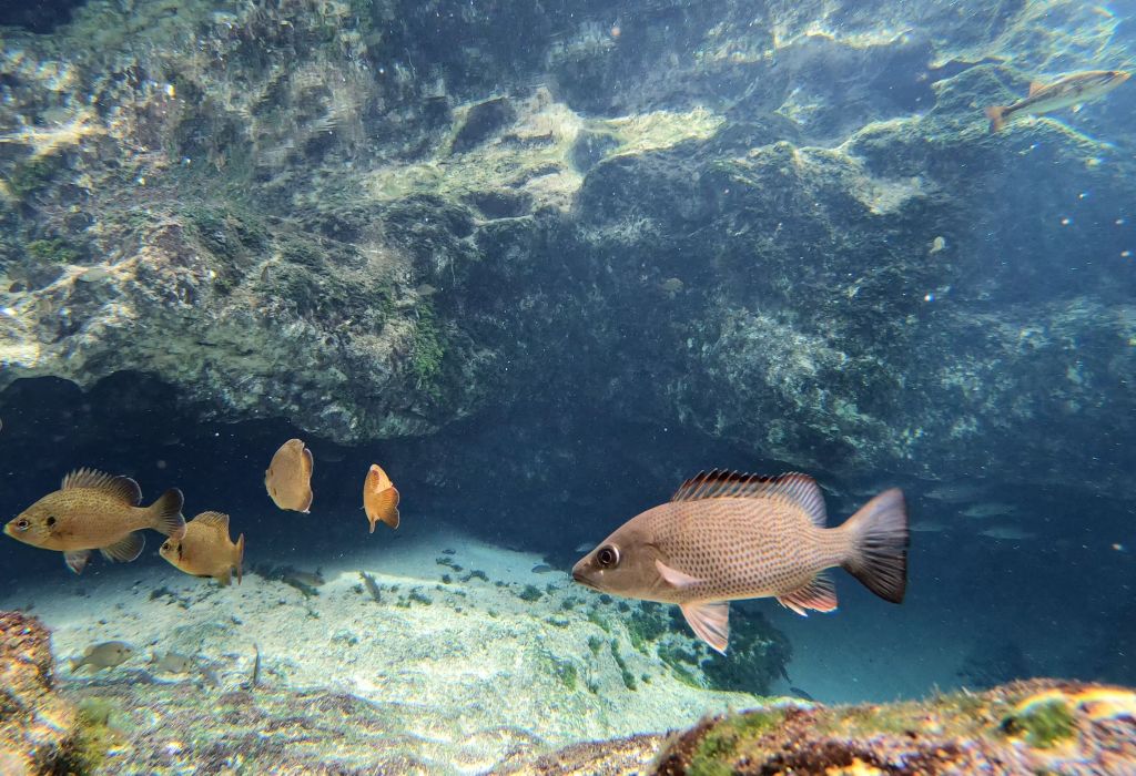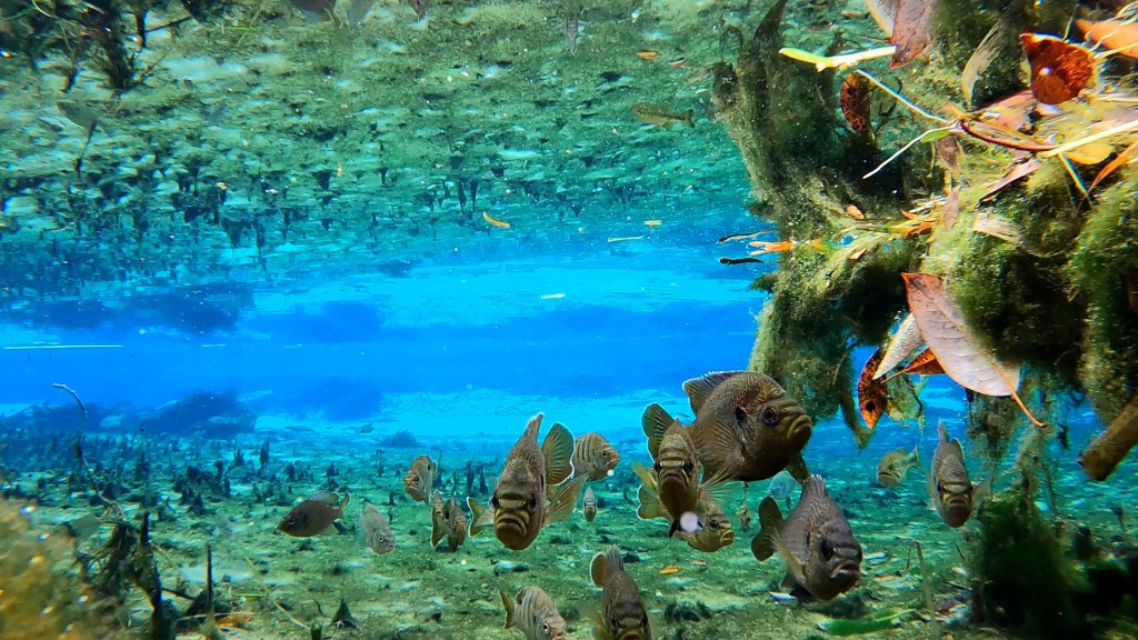 Some impressive largemouth bass and colorful redbreast sunfish (Lepomis auritus) in Alligator Spring run.