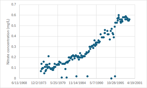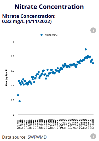 The SWFWMD MFL plan reported an average nitrate concentration of 1.02 mg/L, ranging up to 2.28 mg/L. These values are quite high, much higher than the often-cited 0.35 mg/L background concentration (the MFL report actually used a much lower number for the background: 0.05 mg/L). The report says that: “this [nitrogen concentration] is slightly higher than the mean of 1.17 mg/L for the Rainbow Springs for the same period”. This comparison is interesting, given the much more obvious overlap between human development and Rainbow Spring (there are neighborhoods just north of the headspring and houses down one bank of its run). The MFL plan reported a phosphate concentration of 0.04 mg/L, which is within a stone’s throw of the likely background concentration. So… while Gum Slough feels untouched as you float down it, it has been touched underground by human activity.