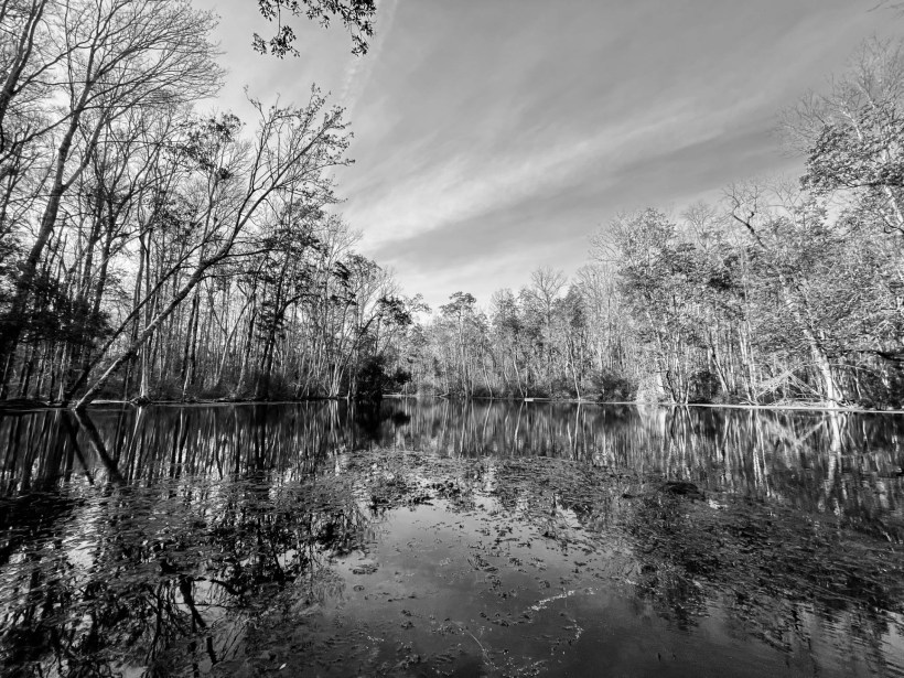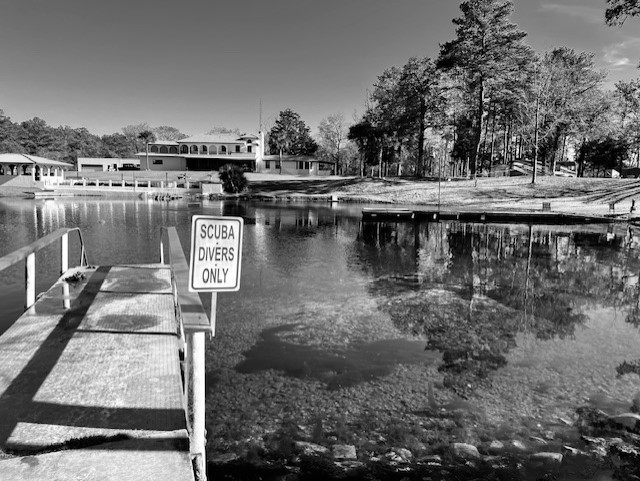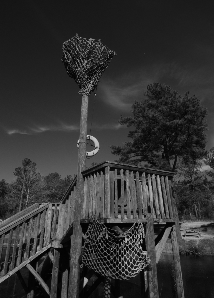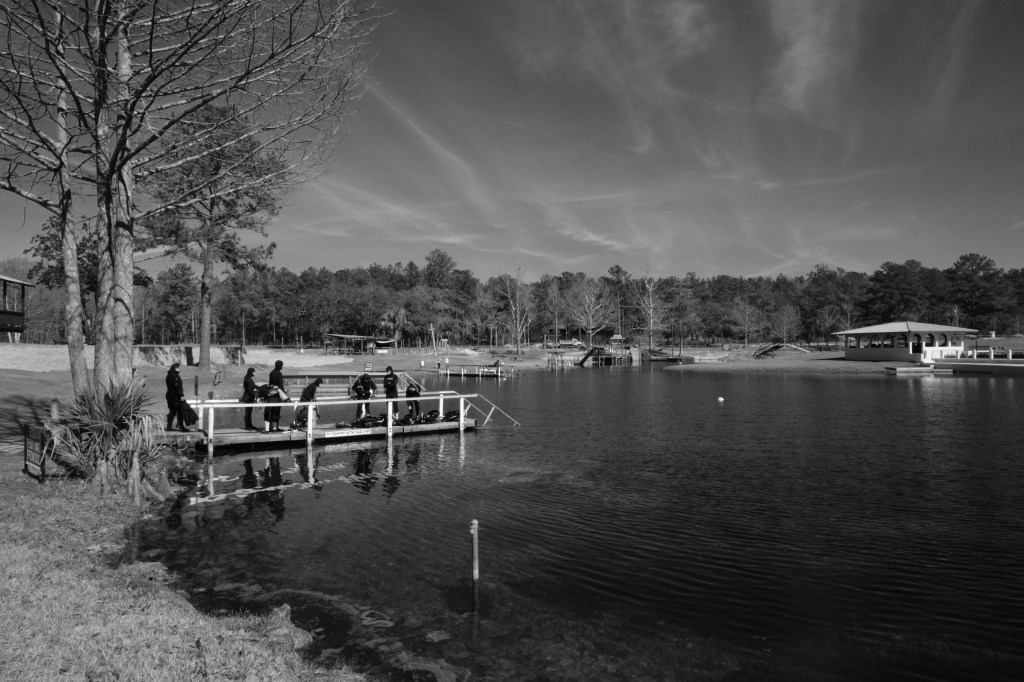 People say that Florida has no seasons, but this photograph says winter to me. The photo is centered on the homemade diving platform at Big Blue Spring on the Wacissa River. The trees, usually so lush, have few leaves, the shadows are long, and the swimmers have been gone for months. Winter on Florida springs is peaceful.