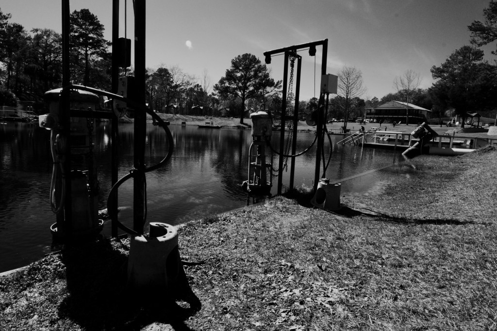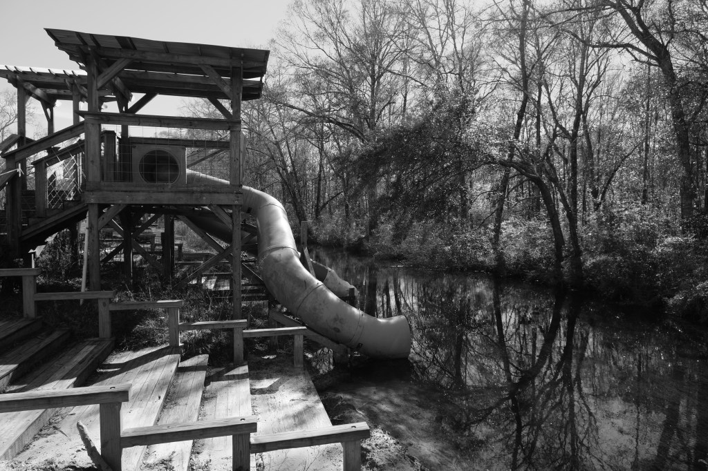 As I moved downstream, the park seemed to shift from dive training to water park. Bridges, a jumping platform, massive inflatable alligators, a mock ship’s crow’s nest, and water slides hinted at the crowds of swimmers that undoubtedly visit in the summer.
