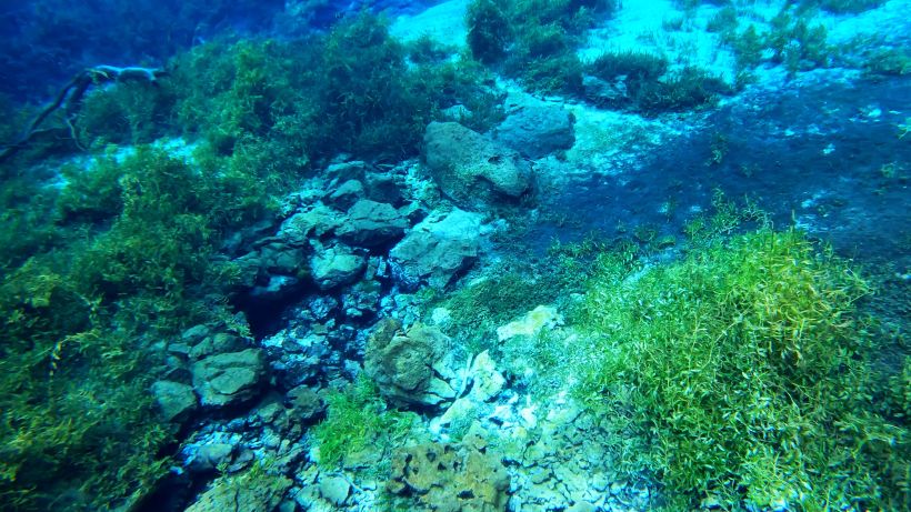 As soon as I floated out of Horsehead Spring, I found myself over a spring vent that I had not realized was there. It was large and dark, but provided substantial flow to the river. I noticed the spring as I floated over it because it, too, looked like a round hole in the plants. In fact, the whole river upstream was thick with plants; the plants were so thick that the birds were walking on them as if on land.